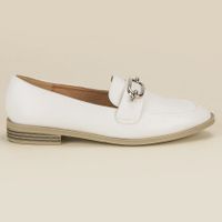 Damskie mokasyny, wykonane ze skóry ekologicznej. Buty na płaskim obcasie, w neutralnym, białym kolorze. Będą odpowiednie do wielu casualowych stylizacji. Sprawdzą się wiosną i latem do spodni oraz sukienek. Wierzch buta ozdobiony jest imitacją klamry w srebrnym kolorze. Wybierz swój rozmiar i kup teraz!