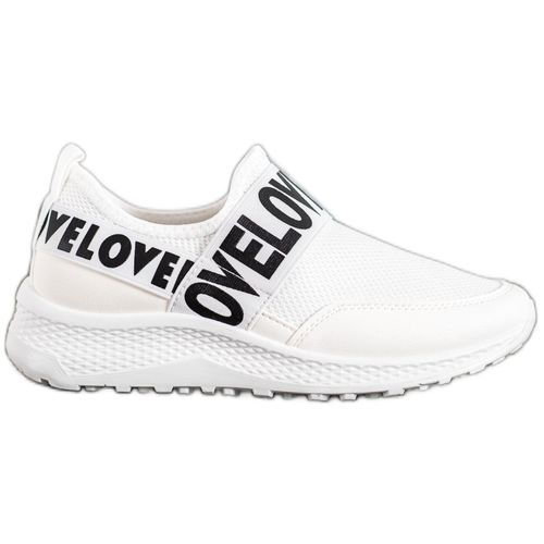 Białe slipony Weide to świetny wybór dla kobiet, które cenią wygodę. To wsuwane obuwie zapewni komfort w ciągu dnia, a dodatkowo zapewni właścicielce modny wygląd. Atrakcyjny element tego modelu stanowi napis „Love” w kolorze czarnym. Buty te posiadają podeszwy z bieżnikiem oraz 3,5-centymetrowe platformy.