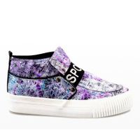 Białe damskie trampki na delikatnej koturnie. Obuwie posiada ciekawy wzorek oraz napis "sport".