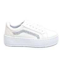 Modne i wygodne trampki damskie w kolorze białym. Buty zostały wykonane ze skóry ekologicznej. Sznurowanie pozwala na idealne dopasowanie obuwia do anatomicznego kształtu stopy. 4 centymetrowe podeszwy z solidnym bieżnikiem gwarantują stabilność i amortyzację w czasie chodzenia. Buty spodobają się każdej miłośniczce mody.