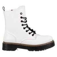 Białe workery to wykonane z estetycznego tworzywa skóropodobnego buty damskie pasujące do wielu różnych stylizacji na co dzień. Cholewki sięgające za kostkę można wygodnie dopasować do stopy za pomocą sznurowania. Modle ten posiada też zapięcie na suwak z boku, a także szeroki obcas o wysokości 3,5 cm.