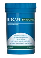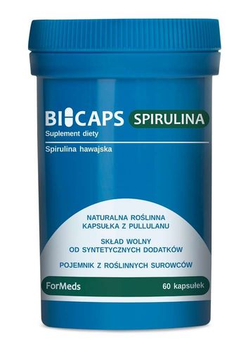 Suplement diety BICAPS SPIRULINA zawiera 530 mg Spiruliny hawajskiej w 1 kapsułce bez żadnych dodatków. Produkt odpowiedni dla wegetarian i wegan.
