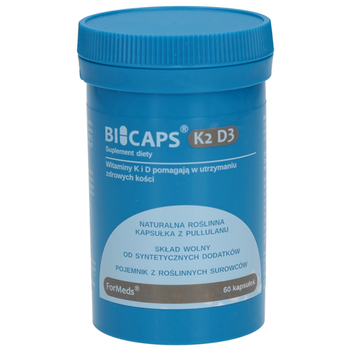 Suplement diety BICAPS® K2 D3 zawiera 100 µg mikrokapsułkowanej witaminy K (K2 MK-7), 2 000 IU witaminy D (D3) oraz 230 mg inuliny w 1 kapsułce bez żadnych dodatków. Produkt odpowiedni dla wegetarian i wegan.