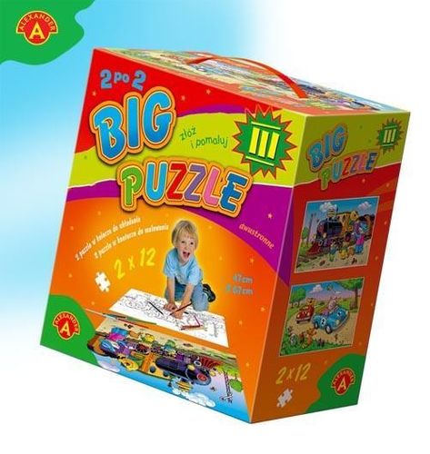 Opakowanie zawiera 2 układanki. Każda układanka jest dwustronna. Z jednej strony znajduje się kolorowy obrazek do układania, z drugiej strony znajduje się konturowy obrazek do układania i kolorowania. Układanki (puzzle) mają wymiar 47 x 67 cm i składają się z 12 elementów.