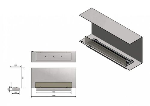 Montaż: Do wbudowania we wnękę, dodatkowo wymagany otwór w podłożu pod kominkiem o wymiarach 800x 170x60mm do wpuszczenia paleniska, wypośrodkowany