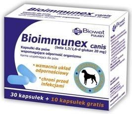 BIOIMMUNEX Canis to kapsułki dla psów wspomagające odporność organizmu.Karma uzupełniająca dla psów- wzmacnia układ odpornościowy- chroni przed infekcjamiSkład kapsułki:β- 1,3/1,6-D-glukan - 20 mg; Substancje pomocnicze i kapsułka - do 318 mg (skrobia pszenna, celuloza, stearynian magnezu, dwutlenek krzemu, żelatyna).Dawkowanie:1 kapsułka na 20kg mc.Zawartość kapsułki można wymieszać z karmą. Przy większej ilości kapsułek wskazane jest podzielić dawkę na 2-3 razy.Właściwości:β-1,3/1,6-D-glukan to naturalny, całkowicie oczyszczony polisacharyd, wyizolowany ze ścian komórkowych drożdży Saccharomyces cerevisiae.Betaglukan silnie stymuluje układ immunologiczny poprzez aktywację makrofagów, limfocytów oraz neutrofili.Makrofagi odgrywają podstawową rolę w odporności przeciwzakaźnej, w usuwaniu nieprawidłowych lub obumarłych komórek oraz substancji obcych z organizmu.Betaglukan wzmacnia działanie innych preparatów stosowanych w leczeniu (antybiotyków, preparatów przeciwgrzybicznych i przeciwpasożytniczych), przyśpiesza procesy regeneracji tkanek, ma właściwości przeciwnowotworowe i jest antyutleniaczem – neutralizuje wolne rodniki.Wskazania:Bioimmunex canis zaleca się podawać psom;- profilaktycznie w celu wzmocnienia naturalnej odporności organizmu;- wspomagająco w okresie leczenia chorób zakaźnych, nowotworowych, oraz w trakcie rekonwalescencji po przebytych chorobach;- w sytuacjach stresowych (wystawy, podróże, zmiana otoczenia).