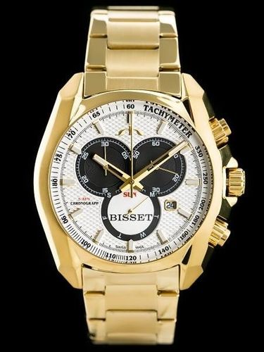 Kolorystyka: Tarcza w kolorze srebrnym, koperta i bransoleta w kolorze złotym, tarcze chronografu w kolorze czarnym