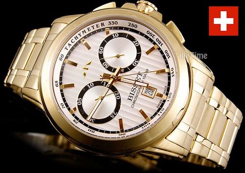 Nowoczesne wzornictwo w parze z jakością i funkcjonalnością – model Bisset z kolekcji szwajcarskiego producenta. Na uwagę zasługuje doskonale zaprojektowany cyferblat będący wyrazem kunsztu designera. Wielofunkcyjny chronograf, łączy funkcje klasycznego czasomierza ze stoperem. Dopełnieniem całości jest elegancka bransoleta wraz z kopertą wykonana ze stali szlachetnej złoconej opatentowaną technologią PVD. Harmoniczny, nowoczesny model na każdą okazję.