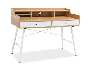Biurko komputerowe B-160 ma mocną podstawę z malowanego na biało metalu, na której opiera się duży blat z płyty MDF w kolorze dębu. Biurko posiada praktyczne półki, które można wykorzystać do przechowywania płyt lub innych rzeczy, a na górze półki z powodzeniem można ustawić monitor lub dekoracje. Pod blatem roboczym znajdują się dwie szuflady o białych frontach. DANE TECHNICZNE: WYMIARY: Długość: 123 cm Głębokość: 65 cm Wysokość: 93 cm MATERIAŁ: Blat - płyta MDF, kolor - biały + dąbStelaż - metal malowany, kolor - biały Towar do samodzielnego montażu. Instrukcja oraz wszystkie narzędzia potrzebne do zmontowania towaru znajdują się wewnątrz opakowania
