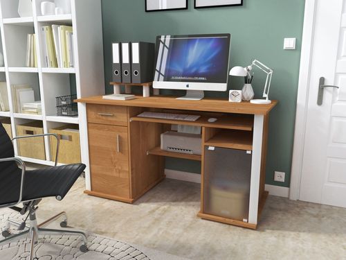 Biurko SPECTRUM to mebel stworzony z myślą o tym, aby praca przy nim była jak najbardziej komfortowa. Wyposażone w pojemne i zamykane szafki oraz szufladę. Ponadto posiada dodatkową półkę na osprzęt komputerowy np. drukarkę. Dzięki swoim wymiarom, poza komputerem, biurko zapewnia dodatkowo mnóstwo przestrzeni na dokumenty bądź inne przedmioty wedle Państwa preferencji.