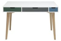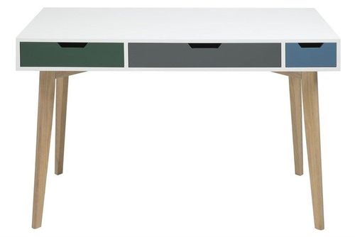 Biurko Tess wykonane zostalo z płyty mdf w kolorze białym oraz 3 szuflad w różnych kolorach. Kolory szuflad wpisują się w kolorystykę modnych wnętrz. Nogi biurka wykonane zostały z drewna jesionowego. Prosta stylistyka, zachowana geometria i styl skandynawski to coś co charakteryzuje biurko Tess.