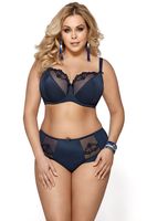 Elegancki biustonosz w konstrukcji soft, z fiszbinami dolnymi i bocznymi, w granatowym kolorze. Wzbogacony misternym, szykownym haftem położonym na siateczkowym tiulu, tuż przy dekolcie. Konstrukcja - jak zawsze u Gorsenii - świetnie zbiera i modeluje, szczególnie te większe piersi. Ramiączka dostosowane do rozmiaru. U ich podstawy, małe, ozdobne kokardki. Wspaniała nowość, którą gorąco polecamy! Skład: 90% poliamid, 7% elastan, 3%poliester.