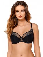 Czarny, intrygujący biustonosz z finezyjnym haftem. Haft zdobi boki miseczek, idealnie komponując się zarówno z gładką tkaniną u podstawy, jak i z prześwitującym, siateczkowym tiulem, widocznym u góry biustonosza. Fiszbiny dolne i boczne, konstrukcja półusztywniana, dobrze unosi i modeluje linię biustu. Wysoka jakość. Skład: 60% poliamid, 20% elastan, 17% poliester, 3% bawełna.