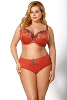 Campari K376 to stylowy, miękki biustonosz w lekko perłowym, rudym kolorze, stworzony dla modnej, eleganckiej i pewnej siebie kobiety. Konstrukcja z serii Big renomowanej marki Gorsenia - kierowana na większe piersi. Fason z fiszbinami, dobrze zbiera biust i odpowiednio go modeluje. Dolna część modelu jest gładka, górna wykonana z haftowanego tiulu z efektem prześwitu, dodaje całości głębi. Skład: 90% poliamid, 7% elastan, 3% poliester.