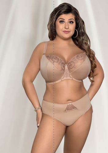 Miękki biustonosz, stworzony z myślą o większych piersiach. Miseczki z fiszbinami (dolnymi i bocznymi), wykonane z dzianiny o podwyższonej odporności na rozciąganie. Dopełnione elegancką, haftowaną koronką, widoczną przy dekolcie. Dobrze unoszą i utrzymują piersi na właściwym miejscu. Regulowane ramiączka.