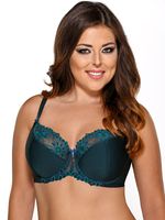 Elegancki, półusztywniany biustonosz w kolorze nasyconej, butelkowej zieleni. W górnej części bardzo ładny, haftowany, dekoracyjny tiul. Podstawa miseczek gładka, podszyta bawełną, z fiszbinami. Biustonosz doskonale troszczy się o większe biusty - unosi je i odpowiednio modeluje, utrzymując we właściwym miejscu.