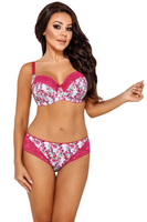 Biustonosz, który odzwierciedla najmodniejsze trendy. Różowo-biały, zdobiony liśćmi palm i pąkami egzotycznych kwiatów. Z koronką przy dekolcie. Usztywniany, z fiszbinami, bardzo kobiecy. Podkreśla wdzięki jak mało który. Piersi uniesione, ładnie zaakcentowane, zebrane do dekoltu. Renomowana marka. Skład: 88% poliamid, 8% bawełna, 4% elastan.