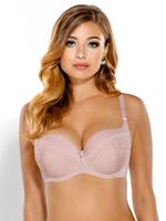 Delikatny, jasnoróżowy biustonosz Sofia Big Full Cup. Przeznaczony szczególnie na większe piersi. Konstrukcja dopasowana do specyficznych potrzeb - świetnie zbiera piersi i doskonale je profiluje. W dolnej części fiszbiny, i śliczny haft. Miseczki usztywniane. Regulowane ramiączka, ozdobione kokardkami.