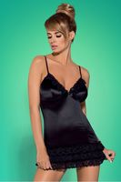Na koszulkę składa się kruczoczarny, satynowy materiał. Posiada ona regulowane ramiączka, głęboki dekolt ozdobiony delikatną koronką, pionowe, wyszczuplające przeszycia i dół wykończony 3-warstwową falbanką.
