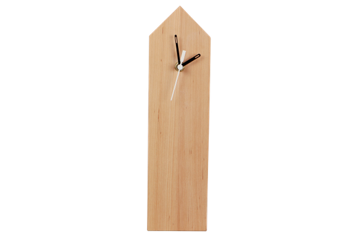 Olchowy zegar w kształcie domu. Nowoczesna, minimalistyczna bryła, będzie doskonałym dodatkiem do Twojego wnętrza. Wykonany z naturalnego drewna olchowego.