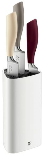 Nowoczesny zestaw 3 noży w bloku marki WMF. Ostrza noży wykonano z wysokiej jakości hartowanej stali nierdzewnej o właściwościach nietępiących. Noże są doskonale wyważone i posiadają ergonomiczne uchwyty zrobione z wysokiej jakości tworzywa sztucznego.