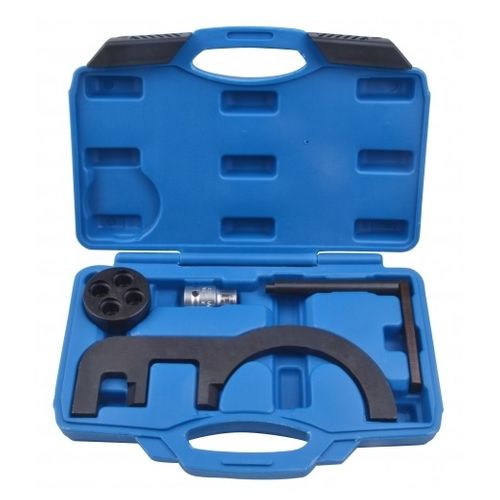 Zestaw zawiera blokadę wałka rozrządu, trzpień do blokowania koła zamachowego, nasadkę 1/2" 10 mm, nasadka do obracania wału korbowego.