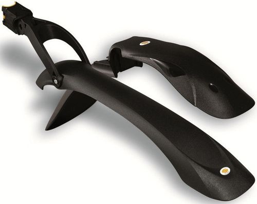 Flagowy komplet błotników to istne terenówki, zaspokoi najbardziej wymagąjace potrzeby ekstremalnej jazdy w trudnym terenie. Komplet składa się z błotnika przedniego Hammer F oraz błotnika tylnego Hammer 2R. Dodatkowo błotniki Hammer 2 zostały wyposażone w odblaskowe elementy mające na celu zwiększenie widocznossci i bezpieczeństwa rowerzysty. Waga 360g Kolor czarny Materiał Tworzywo sztuczne - PP, PC Mocowanie Trzon widelca, sztyca siodła Rozmiar koła 24"-28" Motocrossowa optyka Przystosowany również do widelców Manitou, zapięcie SpeedClick i SpeedStarp Przód do amortyzowanych widelców - SPEEDclick Tył na sztycę (od 25mm do 32mm) - SPEEDstrap Długość przedniego błotnika: 55,5cm Długość tylnego błotnika: 49cm