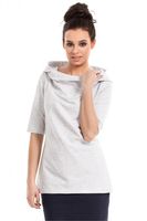 Prosty, minimalistyczny fason bluzy z krótkimi rękawami i ciekawym detalem, kominem przechodzącym w kaptur.