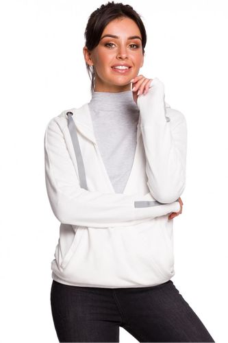Wygodna bluza o ciekawym fasonie. Posiada kopertowy przód, kaptur oraz ozdobne troczki. Sportowego charakteru nadają jej lampasy na mankietach oraz jeden biegnący przez środek kaptura. Bluza jest ściągnięta w pasie gumą i wykonana z elastycznej dzianiny z bawełną, co zapewni Ci komfort noszenia. Idealna do t-shirtów.