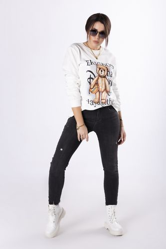 Sportowa, luźniejsza bluza o prostym kroju. Całość wykonana z delikatnie uciągliwej bawełny. Przód modelu zdobi wielobarwny nadruk, który dodatkowo wzbogacono o małe, połyskujące dżety. Długie, proste rękawy z prążkowanymi ściągaczami na końcach. Półokrągły, niewielki dekolt. Model bez podszewki. Długość sięgająca nieco poniżej linii bioder. Bluza sprawdzi się w codziennych, sportowych stylizacjach. Modelka ma 173 cm wzrostu i prezentuje egzemplarz w rozmiarze S/M.