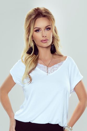 Zjawiskowa bluzka, o pięknym, bardzo kobiecym kroju, wykończona koronką na dekolcie. Z ozdobną lamówką wzdłuż linii ramion i całego dekoltu. Luźny, wygodny krój. Krótkie rękawki z mini mankietami. Propozycja dla każdej miłośniczki tego co wyjątkowe. Wysoka jakość. Skład: 95% wiskoza, 5% elastan.