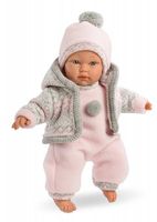 Nasza lalka wykonana jest z wysokiej jakości materiałów. Jej ciało zrobione jest z przyjemnego w dotyku winylu a brzuszek wypełniony miękką wyściółką. Po naciśnięciu brzuszka bobas zapłacze i zawoła: mama, papa!Główkę naszej lalki zdobi różowa czapeczka z pomponem. Bobas ubrany jest w różową piżamkę z szarym pomponem i szarymi elementami, różowo-szarą narzutkę w gwiazdki z kaputrem. Lalka zapakowana jest w kartonowe pudełko, idealne na prezent
