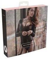 The tight-fitting body is completely made out of soft, elastic stripe material. With long sleeves and hook and loop fastener in the crotch area. Round neckline at the front and back. On each side are 3 elastic suspender straps that are adjustable and completely removable.