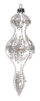 Oryginalna tłoczona bombka transparentna o wysokości 17cm. Bombka bogata w geometryczne tłoczenia przypomina swoją budową sopel. Jej transparentność w połączeniu z delikatnymi, brokatowymi zdobieniami sprawia, że jest bardzo elegancka i niezwykle delikatna.