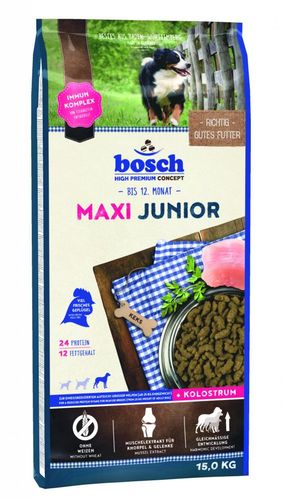 BOSCH MAXI JUNIOR TO PEŁNOPORCJOWA KARMA DLA DORASTAJĄCYCH PSÓW RAS OLBRZYMICH (POWYŻEJ 25 KG) O ZREDUKOWANEJ ILOŚCI BIAŁKA. ŚWIEŻY DRÓB SPRAWIA ŻE KARMA JEST SMACZNA, POŻYWNA I LEKKOSTRAWNA. SKŁAD: Świeży drób (25 %), ryż, jęczmień, sproszkowane mięso drobiowe, kukurydza, pulpa buraczana (bez cukru), tłuszcze zwierzęce, hydrolizowane białko, sproszkowane ryby, suszone jaja, siemię lniane, groch, suszone drożdże piwne (0,1 % mannooligosacharydy, 0,06 % β-glukan), oleje rybne, siara (0,3 %), chlorek sodu, ekstrakt z omułka zielonowargowego (0,1 %), chlorek potasu, cykoria (suszona). SKŁADNIKI ANALITYCZNE: Białko 24,0 %, zawartość tłuszczu 12,0 %, włókno surowe 2,5 %, popiół surowy 6,0 %, wapń 1,2 %, fosfor 0,9 %. DODATKI: Dodatki dietetyczne na kg: Witamina A 15.000 j. m., witamina D3 1.200 j. m.,witamina E 150 mg, miedź (jako siarczan miedzi, pięciowodny) 10 mg, cynk (jako tlenek cynku) 90 mg, cynk (jako chelat aminokwasowy cynku, uwodniony) 75 mg, jod (jako jodek wapnia, bezwodny) 2 mg, selen (jako selenian sodu) 0,2 mg. Przeciwutleniacze.