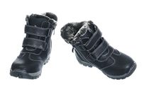 Trzewiki chłopięce w kolorze czarnym wykonane ze skóry ekologicznej. Środek buta włącznie z wkładką ocieplony szarym, miękkim futerkiem. Buty zapinane na dwa rzepy oraz suwak po wewnętrznej stronie cholewki, co ułatwia ich zakładanie i zdejmowanie, jednocześnie zapewnia dobre dopasowanie bucika do nogi dziecka. Pięta jest usztywniona. Posiadają stabilną antypoślizgową podeszwę.