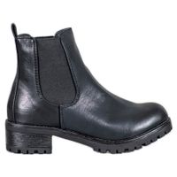 Botki damskie na masywnej podeszwie z protektorem wykonane są z ekologicznej skóry w czarnym kolorze. Cholewki sięgające za kostkę mają wstawki z elastycznych gumek ułatwiające wkładanie, a ocieplone wnętrze i szeroki obcas o wysokości 4,5 cm sprawiają, że buty te będą idealnym uzupełnieniem wielu różnych stylizacji.