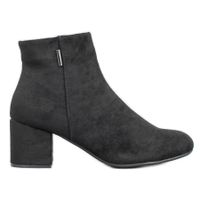 Modne oraz bardzo wygodne botki w kolorze czarnym. Buty wyprodukowano z najwyższej jakości zamszowej skóry ekologicznej. Obcasy na solidnym słupku zapewnią komfort oraz stabilność w czasie chodzenia. Botki będą idealnie pasowały do wielu różnych stylizacji. Z całą pewnością przypadną do gustu paniom w różnym wieku.