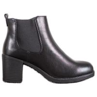 Stylowe czarne botki damskie wykonane są z estetycznej skóry ekologicznej i mają cholewki sięgające za kostkę, ozdobione z boku wstawką z szerokiej gumki. Buty te są zapinane na suwak umieszczony od wewnętrznej strony, a ich stabilny obcas typu słupek o wysokości 7 cm zapewnia wygodę podczas chodzenia.