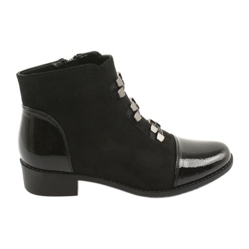 Szykowne botki marki Daszyński to precyzyjne wykonanie ze skóry ekologicznej zamszowej połączonej z skórą lakierowaną, w kolorze czarnym. Obuwie doskonale prezentuje się w duecie ze stylizacją każdego typu - zarówno wizytową, jak i codzienną. Płaski obcas i ciekawe, subtelne zdobienie z przodu - delikatne klamerki, pozwalają na zachowanie modnych i stylowych. Buty zimowe damskie to wybór najlepszy z możliwych. Botki wyściełane są przyjemnym obuwniczym miękkim czarnym futerkiem, gwarantującym zachowanie ciepła nawet podczas większych chłodów.