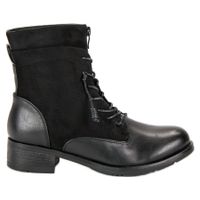 Botki damskie workery w kolorze czarnym, zapinane na suwak, ze sznurowaniem. Buty na płaskim obcasie o wysokości 3,5 cm. Zostały wykonane ze skóry ekologicznej i zamszu ekologicznego. Ocieplenie i wkładkę wykonano z materiału tekstylnego. Doskonale sprawdzą się na co dzień jako uzupełnienie casualowych stylizacji.
