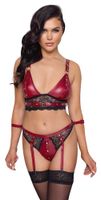 Bralette plus majtki do pończoch marki Cottelli BONDAGE w kolorze szlachetnej czerwieni, z delikatnymi wstawkami z czarnej koronki i metalowymi elementami w kolorze srebra. Bralette uwodzi rozcięciem w miseczkach, które można szybko otworzyć dzięki zatrzaskom. Ramiączka i pasek pod biustem są regulowane dla optymalnego dopasowania. Dzięki zatrzaskom majtki można również rozpiąć od mons veneris do góry. Po bokach i z tyłu zamocowane są pierścienie, przez które można przeciągnąć dwa dołączone paski na kostki (zapinane na rzepy). Paski na pośladkach są regulowane i można je nawet całkowicie odpiąć.