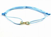 Bransoletka wykonana na sznurku w kolorze błękitnym. Elementy srebrne, pozłacane 24 karatowym złotem. Złocenie wykonywane jest specjalną techniką, dzięki której złocenie jest bardziej odporne na ścieranie. Regulacja długości. Hand made.