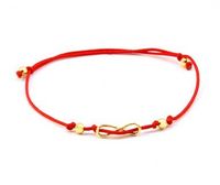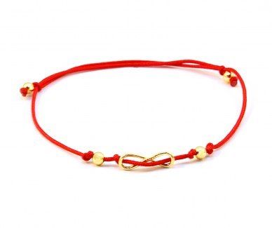Bransoletka wykonana na sznurku w kolorze czerwonym. Elementy srebrne, pozłacane 24 karatowym żółtym złotem. Złocenie wykonywane jest specjalną techniką, dzięki której złocenie jest bardziej odporne na ścieranie. Regulacja długości. Hand made.