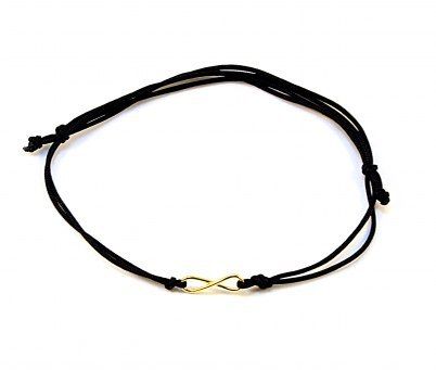 Bransoletka wykonana na sznurku w kolorze czarnym. Elementy srebrne, pozłacane 24 karatowym złotem. Złocenie wykonywane jest specjalną techniką, dzięki której złocenie jest bardziej odporne na ścieranie. Regulacja długości. Hand made.