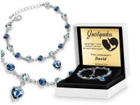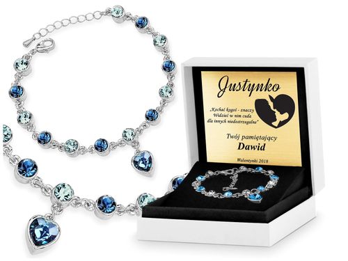 Elegancka bransoletka została wykonana z wysokiej jakości stopu miedzi i cynku. Powierzchnię biżuterii pokryto warstwą białego złota za pomocą nowoczesnej metody electroplated. Dzięki tej technice złocenie jest niezwykle trwałe i nie uczula. Każdy element bransoletki został wzbogacony efektownym kryształkiem z serii Swarovski Elements. Precyzyjnie wyszlifowane kryształki w głębokim morskim odcieniu są głównym elementem tej nietuzinkowej kompozycji. Ta bransoletka z pewnością idealnie sprawdzi się jako prezent dla każdej kobiety ceniącej klasyczną elegancję i wyrafinowany charakter szlifu elementów Swarovskiego.