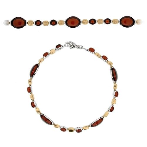 Intrygująca i elegancka bransoletka segmentowa wykonana w całości ze srebra próby 925 częściowo pozlacanego, z naturalnymi certyfikowanymi bursztynami bałtyckimi w kolorze szlachetnej wiśni. Wymiary: Szerokość wyrobu: 0.7 cmPrzybliżona waga: 6.9 gramDługość bransoletki: 16 cm Doskonała jakość wykonania gwarantowana. Do każdego produktu dodajemy eleganckie pudełko i metkę jubilerską z pustym miejscem na cenę - tak przygotowana biżuteria staje się idealnym prezentem. Autentyczność kamieni potwierdzona dołączonym do produktu certyfikatem.
