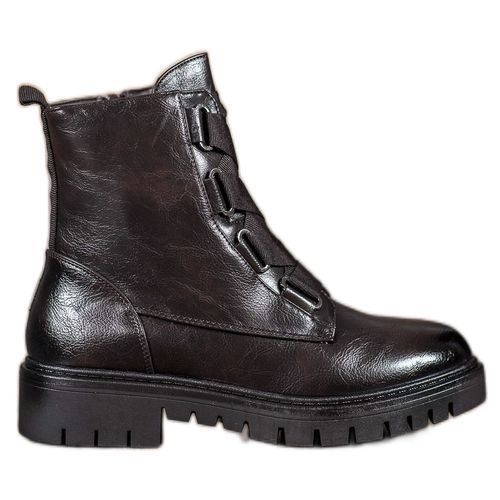 Zostały w całości wykonane ze skóry ekologicznej. Wiązanie oraz zamek błyskawiczny od ich wewnętrznej strony gwarantują, że buty będą idealnie trzymać się stopy.