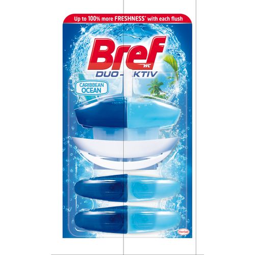 Dzięki dwóm komorom zbiorniczka, Bref Duo-Aktiv łączy działanie środka do mycia toalety i odświeżacza w jednym produkcie.