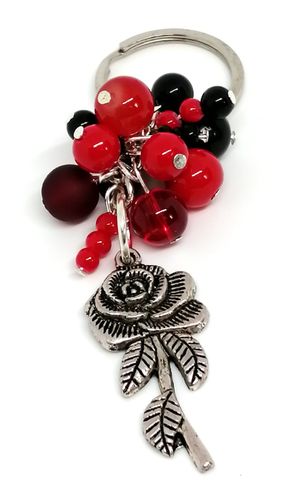 Breloczek z piękną zawieszką w kształcie róży. Ozdobiony koralikami szklanymi i powlekanymi. Długość breloczka 10,5cm. Idealny do kluczy lub jako zawieszka do torebki.